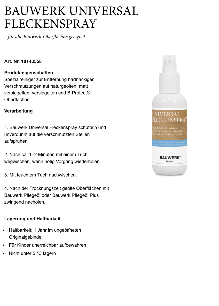 1. Bauwerk Universal Fleckenspray schütteln und unverdünnt auf die verschmutzten Stellen aufsprühen.